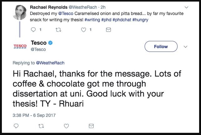 Dịch vụ khách hàng vẫn cần thiết và những người tại Tesco đã chọn sử dụng Twitter như một cách thức thực hiện điều này để kết nối với khách hàng. Họ cho thấy họ quan tâm bằng cách thêm cá nhân hóa vào tương tác của họ với khách hàng.