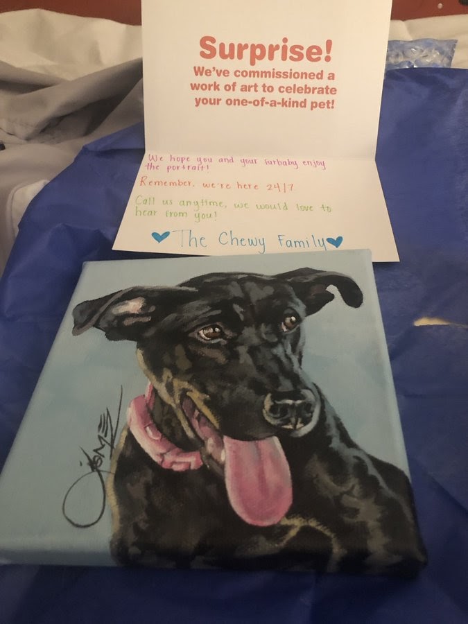 Ví dụ dưới đây là một bức tranh mà Chewy đã đặt vẽ cho thú cưng của khách hàng – những ý tưởng khác có thể là thư cảm ơn viết tay hoặc các mẫu sản phẩm mới miễn phí.