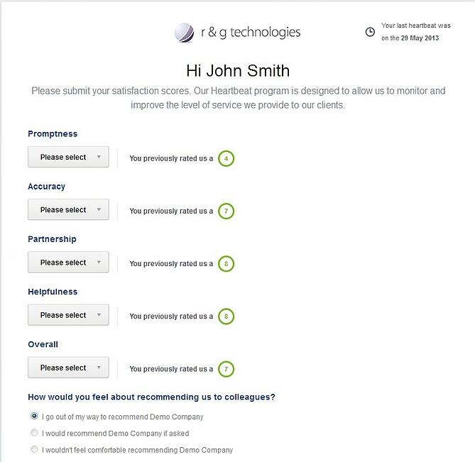 Tuy nhiên, ở các cuộc khảo sát về mức độ hài lòng của khách hàng, R&G Technologies cho khách hàng cơ hội đánh giá về chất lượng dịch vụ của họ. Điều này cho phép họ xác định những khách hàng không hài lòng trước khi họ rời khỏi.