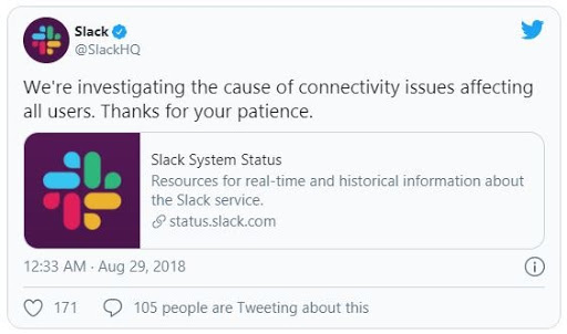 May mắn là, Slack luôn ở đó để giúp đỡ khi mọi thứ gặp trục trặc. Họ biết người dùng của họ đang hoạt động trên Twitter và họ cập nhật thường xuyên trên đó trong trường hợp ngừng hoạt động hoặc các vấn đề khác của khách hàng.