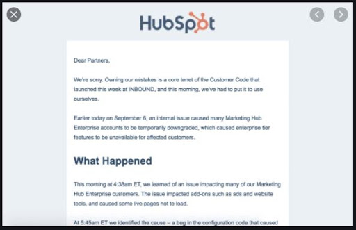 HubSpot đã có một trải nghiệm về điều này trong INBOUND 2018, khi sự cố mất điện mà họ gặp phải đã ảnh hưởng đến nhiều khách hàng doanh nghiệp của họ. Họ đã nhanh chóng làm việc để khắc phục lỗi, tìm hiểu cách nó xảy ra như thế nào để ngăn nó xảy ra lần nữa – và sau đó, COO và Phó chủ tịch Customer Success khách hàng của họ đã xin lỗi, giải thích những gì đã xảy ra và nêu chi tiết cách họ ngăn nó xảy ra lần nữa – công khai trên blog của họ và gửi mail riêng cho khách hàng của họ.