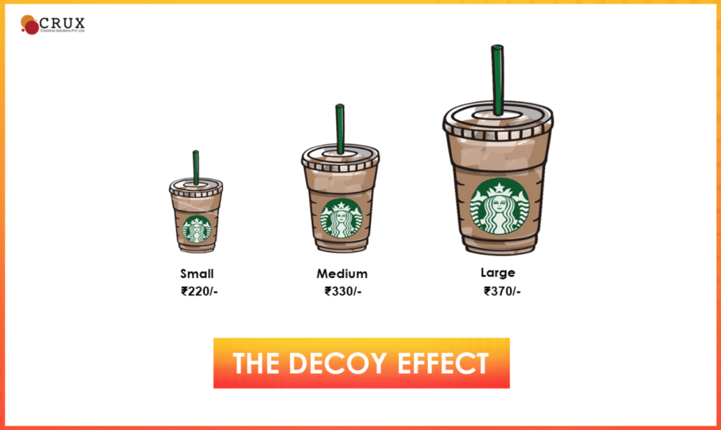 Khách hàng có nhiều khả năng sẽ mua cốc nào hơn? Ở đây, biến mồi nhử là chiếc cốc cỡ vừa thu hút khách hàng mua phần lớn với mức giá có vẻ hợp lý hơn.