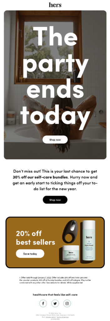 Ví dụ này của Hers cố gắng giải quyết khuynh hướng nhận thức này. Bắt đầu từ dòng chủ đề, họ thêm khung thời gian để thúc đẩy người đăng ký yêu cầu bán hàng nhanh chóng và tiếp tục ở cùng một định dạng viết quảng cáo. Sử dụng các cụm từ như “ Kết thúc hôm nay” và “Mua ngay bây giờ”, họ nhắc nhở khách hàng rằng nếu không hành động nhanh, họ sẽ mất các ưu đãi hấp dẫn.