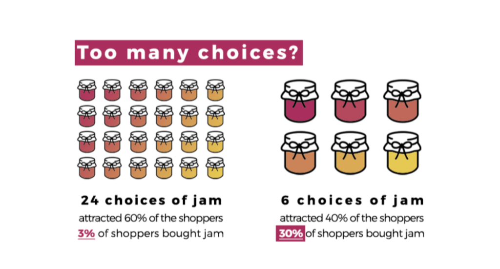 Để giúp khách hàng và khách hàng tiềm năng của bạn khắc phục tình trạng tê liệt trong phân tích, tốt nhất là cung cấp cho họ ít lựa chọn hơn với chất lượng tốt để giúp họ quyết định nhanh hơn đâu là lựa chọn tốt nhất. Mẹo tâm lý tiếp thị này áp dụng cho các cửa hàng thực tế và thương mại điện tử khi tạo danh mục sản phẩm.