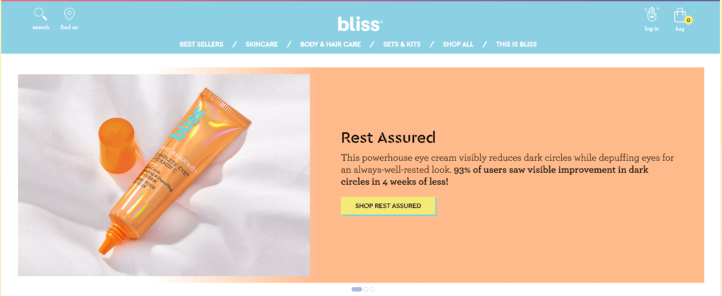 Nhìn vào thanh điều hướng trực tuyến này từ Bliss . Danh mục sản phẩm của họ rõ ràng, theo sau là menu thả xuống để chọn danh mục phụ và sản phẩm: