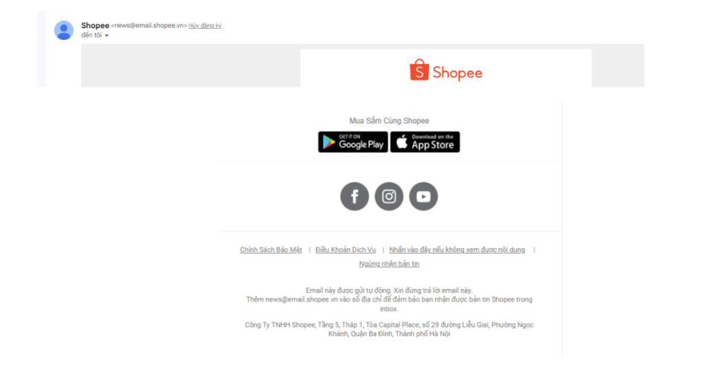 Bỏ qua yếu tố quảng cáo do tính chất tổ chức thì shopee cũng là một trong những bên có thiết kế email với các thông tin cần thiết, rõ ràng.