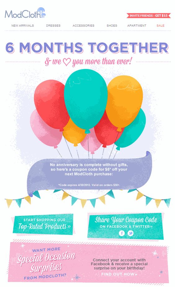 Email này từ ModCloth khá thông minh – bằng cách cung cấp một phiếu giảm giá như một món quà kỷ niệm 6 tháng. Ai mà không thích cảm thấy đặc biệt hơn? Không một ai.