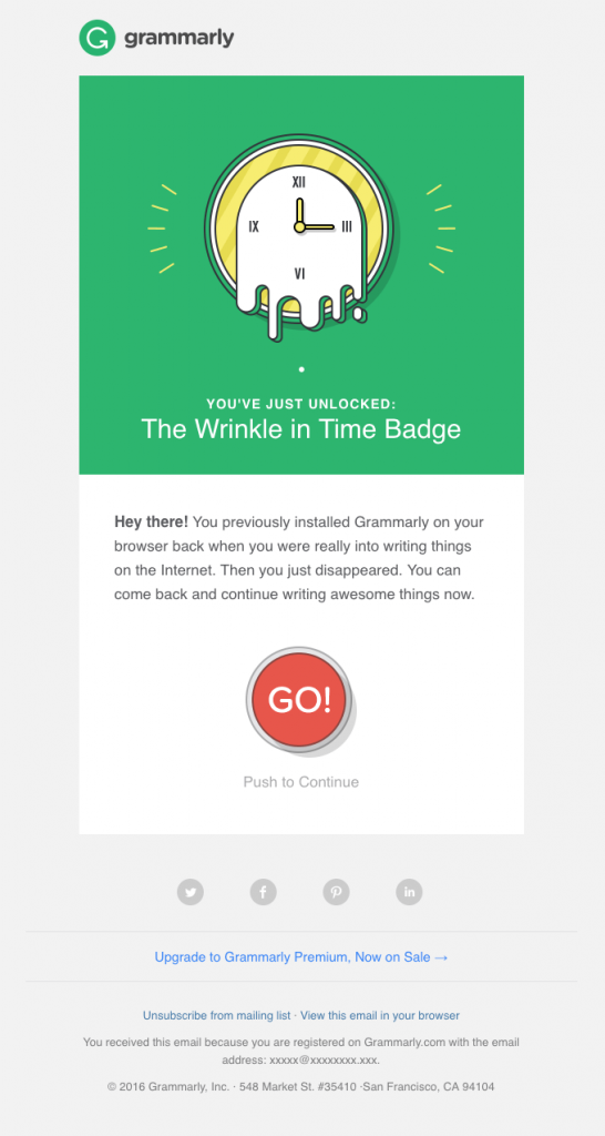 Grammarly thu hút lại những subscribers không hoạt động bằng cách gửi họ huy hiệu “Wrinkle in Time”. Oprah W. hẳn rất tự hào về chúng.