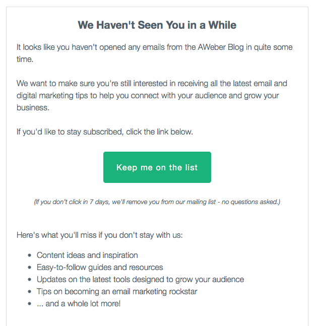 Đặt câu hỏi cho các liên hệ không hoạt động của bạn sẽ giúp họ nhớ lý do tại sao họ đã đăng ký danh sách của bạn ngay từ đầu.
