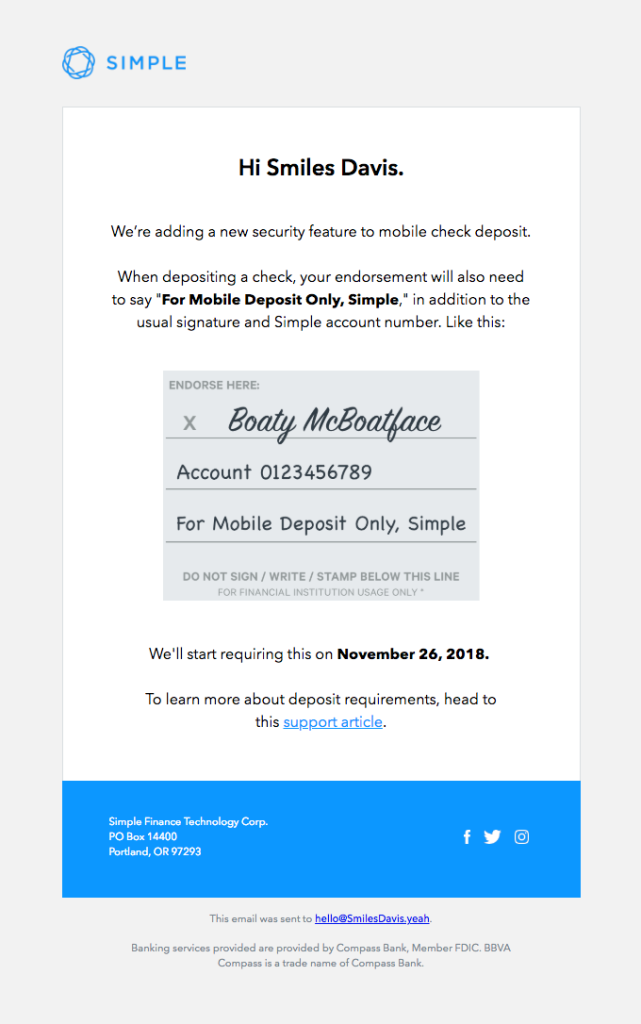 Một phần khác của việc thiết lập chiến lược email cho các nhà cung cấp dịch vụ tài chính là cung cấp thông tin quan trọng cho khách hàng mà không yêu cầu họ đến chi nhánh ngân hàng.