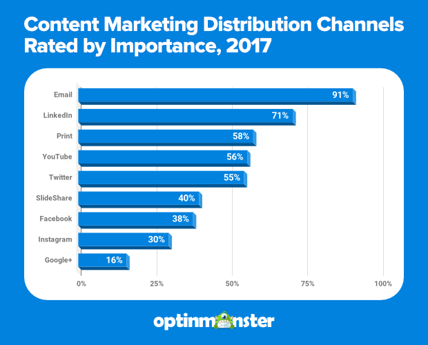 Các nhà tiếp thị cũng thích email. 91% các nhà tiếp thị B2B (từ doanh nghiệp đến doanh nghiệp) trong một nghiên cứu của Viện Tiếp thị Nội dung đã xếp hạng email là loại hình quan trọng hoặc rất quan trọng đối với các nỗ lực phân phối tiếp thị nội dung của họ.