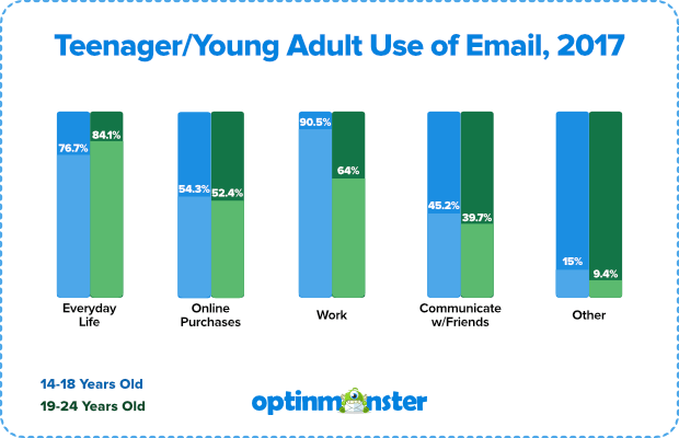 Chỉ riêng ở Mỹ, hơn 90% người trên 15 tuổi, hóa ra: bất chấp sự gia tăng của các ứng dụng nhắn tin xã hội, hơn 3/4 thanh thiếu niên vẫn đang sử dụng email. Trên thực tế, họ coi email là một thực tế của cuộc sống hàng ngày.