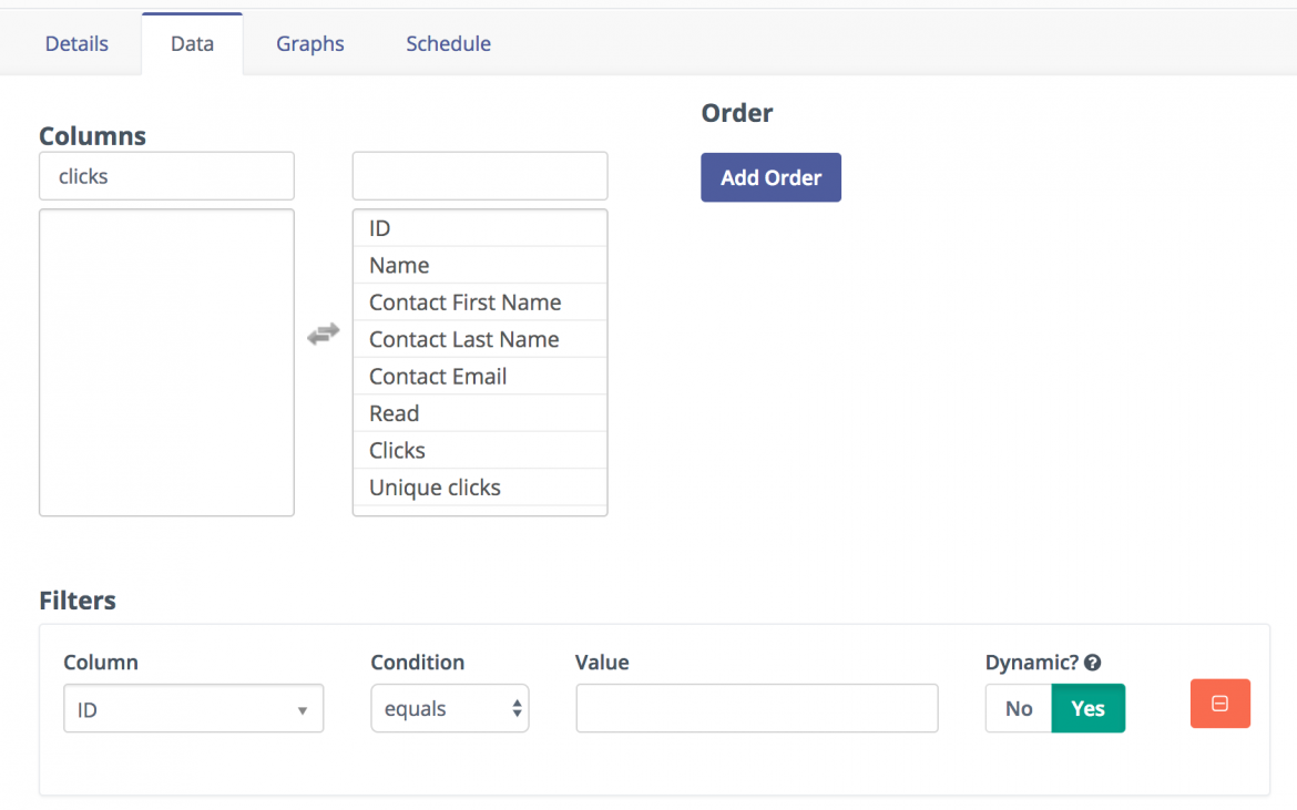 - Chúng tôi khuyên bạn nên thêm vào một bộ lọc trống cho tên email hoặc ID. Sau đó, thiết lập thanh trượt “Dynamic” vào mục “Yes” : Điều này sẽ cho phép bạn chuyển đổi dễ dàng trong báo cáo để xem xét các email khác nhau. (xem hình dưới đây)