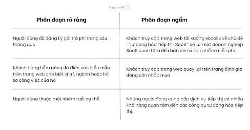 Phân khúc rõ ràng dựa trên dữ liệu chính xác, thường do người dùng cung cấp trực tiếp, như thông tin cá nhân hoặc dữ liệu nhân khẩu học. Phân khúc rõ ràng giúp tạo nội dung hoặc nhắm mục tiêu người dùng dựa trên độ tuổi, giới tính, vị trí, vai trò công ty, v.v.