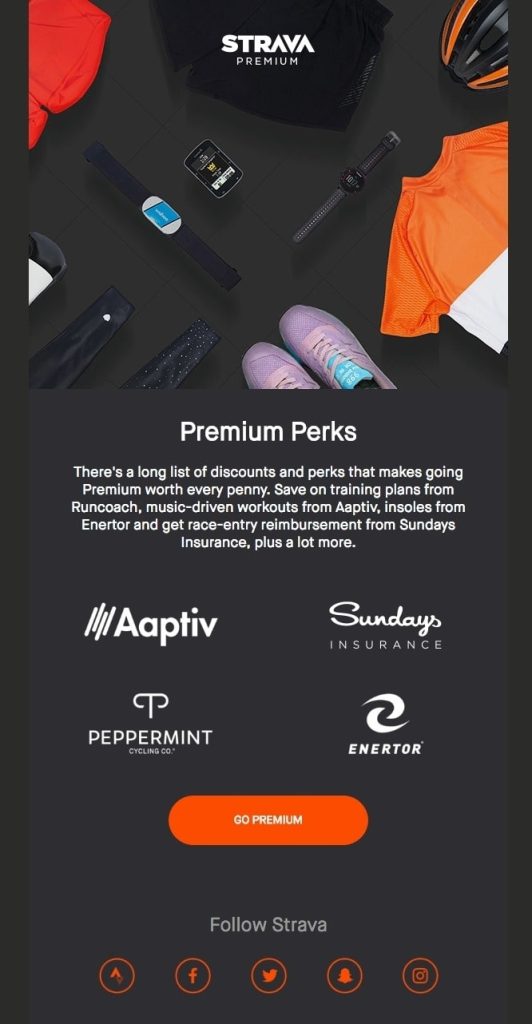 Tiếp thị qua email có thể là cách cốt lõi để một công ty SaaS bán thêm phiên bản trả phí của sản phẩm. Trong mẫu email này từ Strava, một ứng dụng chạy trên thiết bị di động, bạn có thể thấy rằng họ đi thẳng vào vấn đề với các đặc quyền khi nâng cấp lên tài khoản trả phí. Biểu trưng của các dịch vụ bổ sung giúp tăng độ tin cậy và tỷ lệ chuyển đổi cho Strava.
