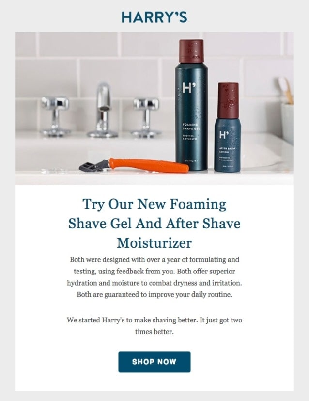 Harry là một công ty chuyên về cạo râu, và khi họ chuẩn bị tung ra một sản phẩm mới, họ phải đảm bảo rằng tất cả khách hàng của họ đều biết điều đó thông qua email. Gel tạo bọt mới chắc chắn phù hợp với cơ địa người dùng, vì vậy họ chắc chắn sẽ thu hút một số sự quan tâm. Thiết kế email đơn giản và đi thẳng vào vấn đề. Tuy nhiên, điều tôi sẽ thay đổi là CTA: “Hãy thử ngay bây giờ” sẽ có vẻ ít cam kết hơn “Mua ngay bây giờ”.