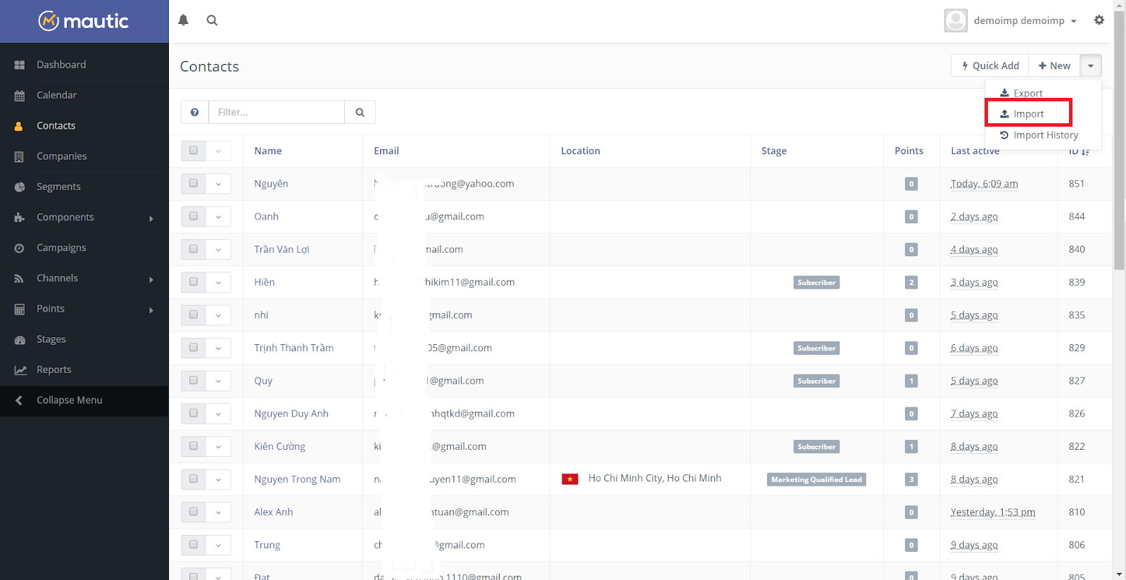 Ngoài thông tin từ việc import Data từ Excel vào, Mautic cũng sẽ lưu lại tất cả các thông tin, quá trình tương tác của khách hàng tiềm năng với bạn. Ví dụ như: