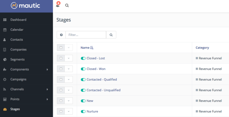 Các giai đoạn được thiết lập trong menu quản trị của Mautic trong phần Stages – khá đơn giản.