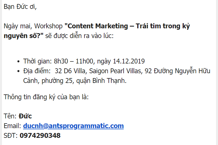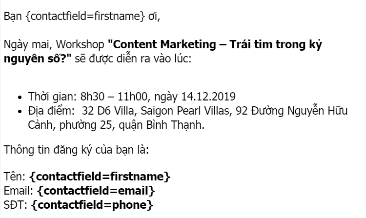 Tính cá nhân hóa Email của Mautic là vô cùng mạnh dựa vào những trường thông tin thu thập được. Ví dụ điển hình sau đây là nội dung cá nhân hóa trong 1 Email