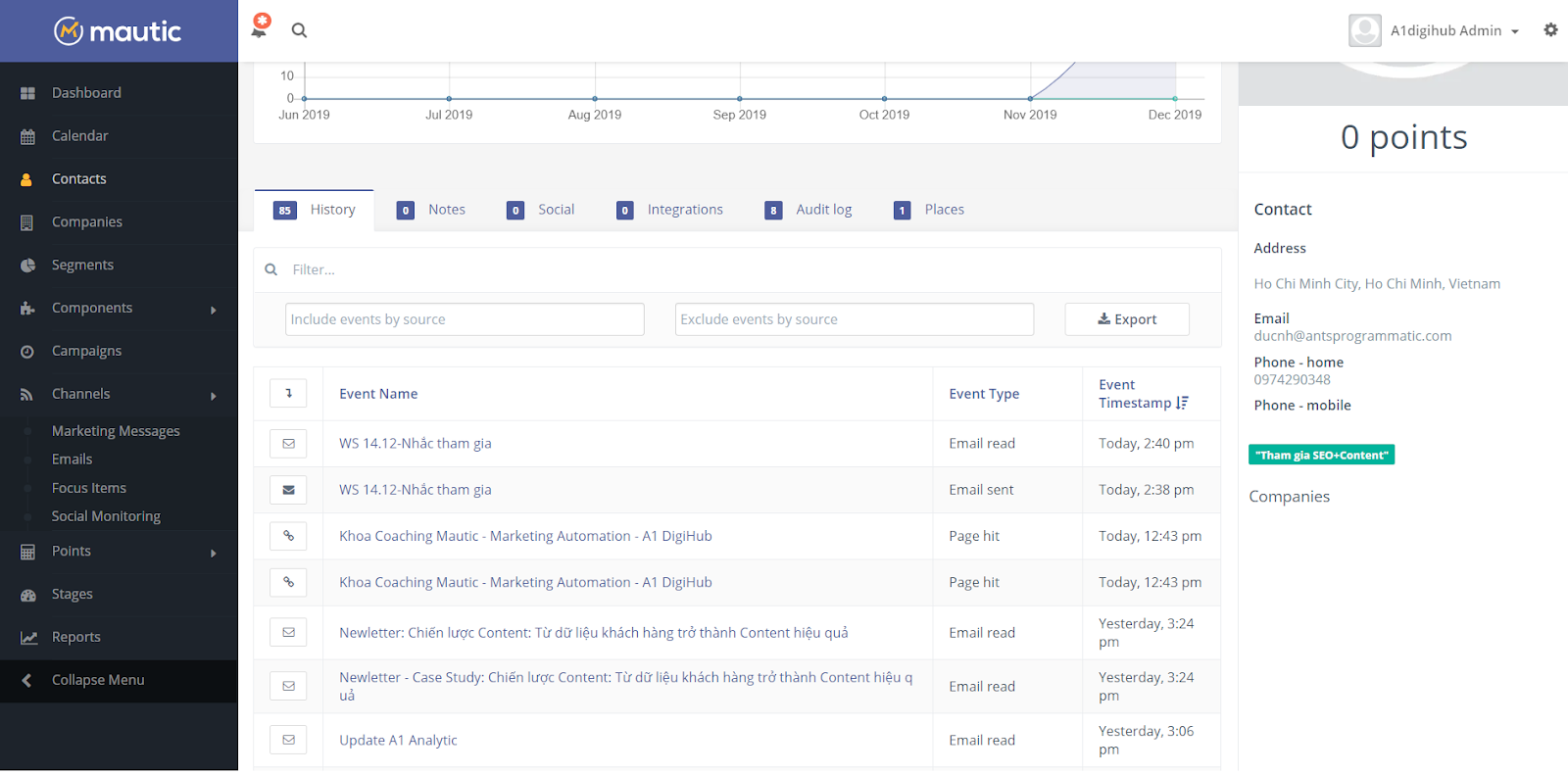 Ngoài thông tin từ việc import Data từ Excel vào, Mautic cũng sẽ lưu lại tất cả các thông tin, quá trình tương tác của khách hàng tiềm năng với bạn. Ví dụ như: