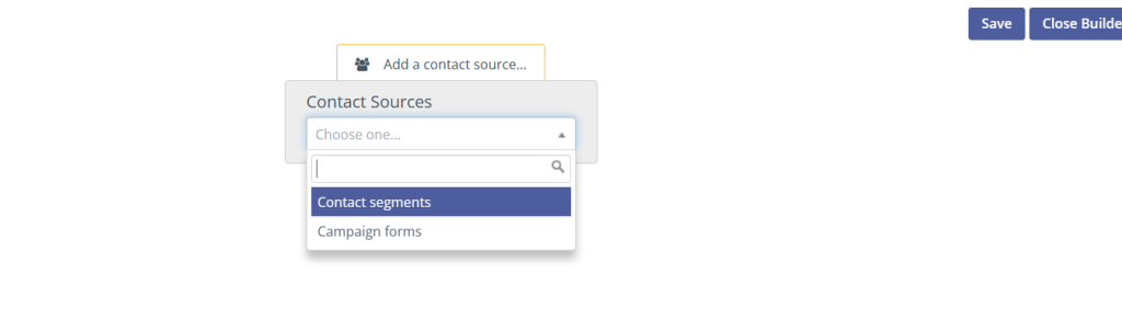 Khi bạn đã chọn một trong hai: Segment hoặc Campaign form, bạn sẽ chọn các Segment hoặc form để sử dụng. Nếu bạn muốn sử dụng cả hai, hãy sử dụng nút chọn màu xám ở bên trái hoặc bên phải của hộp Contact source để thêm bất kỳ loại nguồn nào bạn đã không chọn ban đầu.