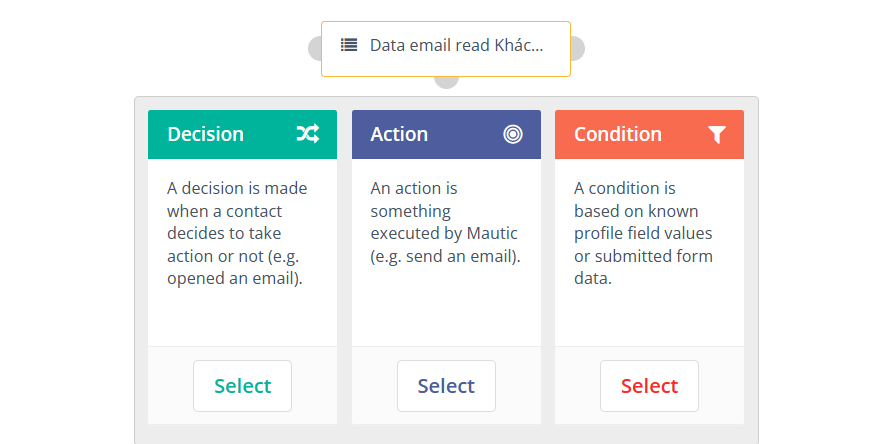 Nếu một contacts làm điều gì đó, Mautic gửi họ xuống đường dẫn màu xanh lá cây ở phía bên trái của hộp điều kiện, điều này biểu thị cho “yes”.