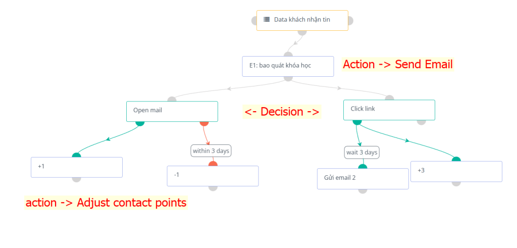 Không có lựa chọn lên lịch cho các decisions. Ngay khi các tiêu chí cho decisions được đáp ứng, contact được đưa xuống luồng xanh/yes. Bất kỳ action hoặc conditions sau khi decisions được lên lịch riêng. Bất kỳ action nào trên đường dẫn màu đỏ/không có sẽ “chờ” một khoảng thời gian xác định trước khi kích hoạt.