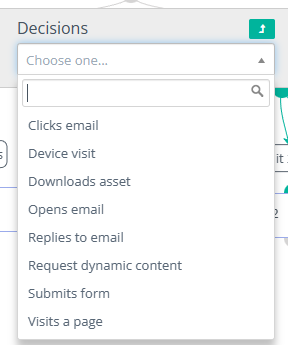 Việc thêm decisions, actions, hoặc conditions thì đơn giản. Sau khi chọn nguồn liên hệ, nhấp vào vòng tròn màu xám ở dưới cùng của hộp Contact Source để chọn loại sự kiện.