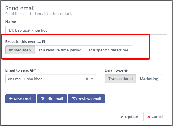 Immediately (Ngay lập tức): Kích hoạt action ngay khi liên hệ đến sự kiện chiến dịch.