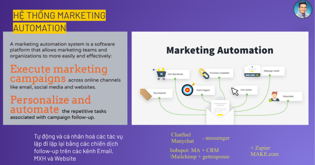 Hệ thống Marketing Automation là hệ thống có thể tự động và cá nhân hóa các tác vụ lặp đi lặp lại những chiến dịch follow up trên các kênh email, mạng xã hội, website, app,…