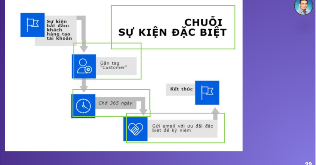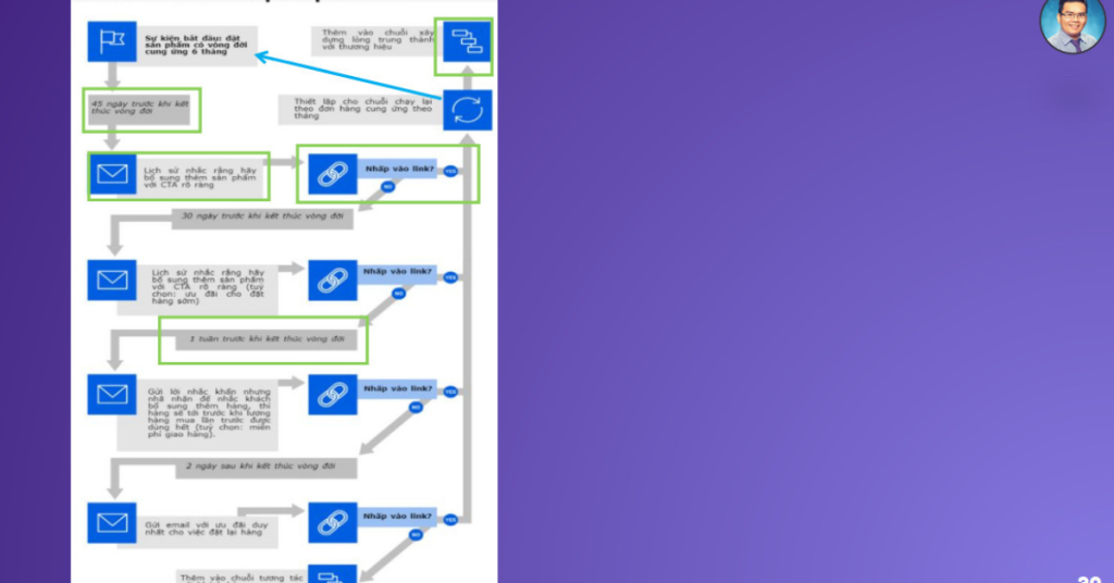 Ví dụ bán một số sản phẩm như mỹ phẩm có vòng đời 6 tháng. Khoảng 45 ngày trước khi hết hạn 6 tháng, ta gửi email nhắc nhở mua thêm sản phẩm. Nếu họ nhấp vào link và mua thêm, ta chuyển họ đến chuỗi khách hàng trung thành hoặc gắn tag và cập nhật thông tin. Có thể đưa ra các khuyến mại, giảm giá trong nội dung nhắc lại mua sản phẩm.
