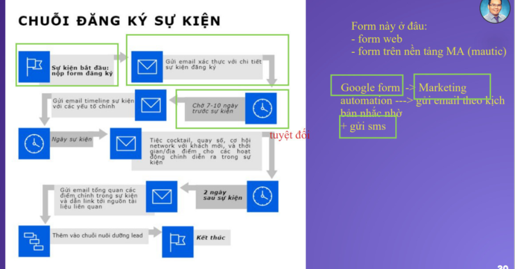 Phải xác định form đăng kí từ đâu: web, trên nền tảng Mautic hay Google Form. Nền tảng Mautic chỉ có thể gửi email theo kịch bản nhắc nhở và không thể tích hợp với Google Form. Nếu muốn tích hợp thì phải dùng đến nền tảng NO CODE thứ ba: Make hay Zapier.