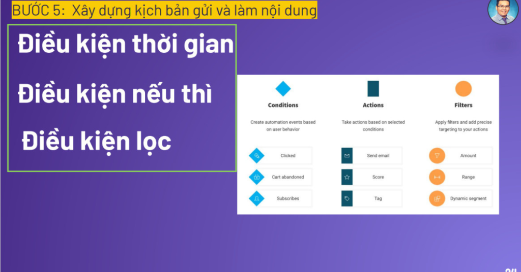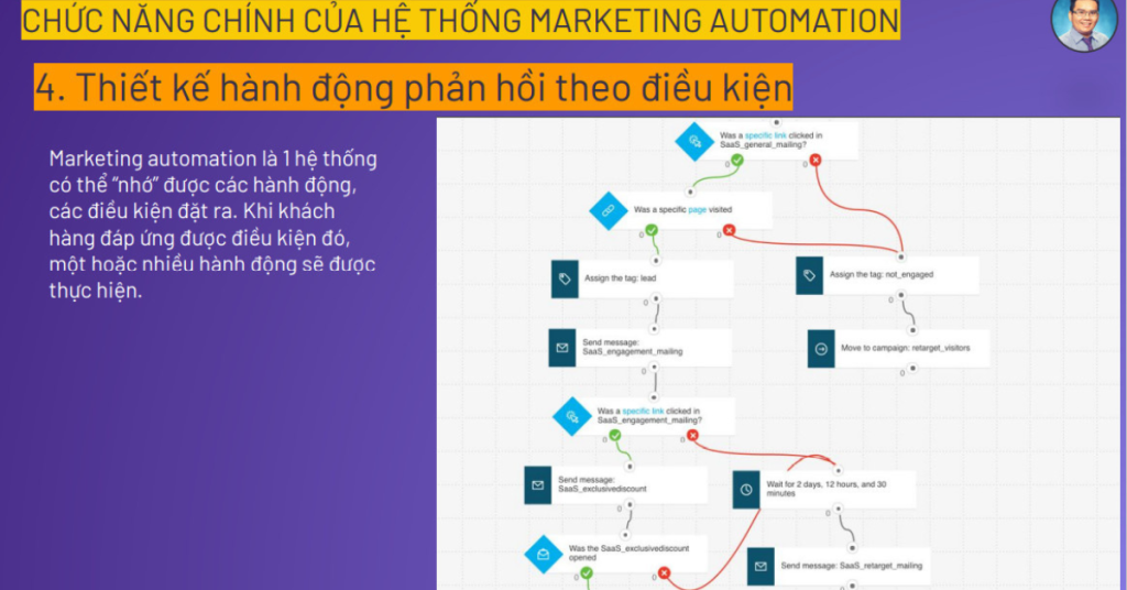 Những điều kiện này cần phải được lên kế hoạch trước, có thể là điều kiện về thời gian (mở mail sau 1 ngày, hoặc sau 2 ngày…), điều kiện phản hồi (mở, xem email…) hoặc điều kiện lọc. Ví dụ cho điều kiện lọc: Đối với mô hình kinh doanh B2B về phần mềm, khi khách hàng điền form liên hệ có khai báo chức vụ thuộc cấp quản lí trở lên, họ sẽ được chuyển qua sale team chăm sóc. Ngược lại, với những khách hàng cấp quản lí trở xuống, họ sẽ được phân vào nhóm gửi tự động.