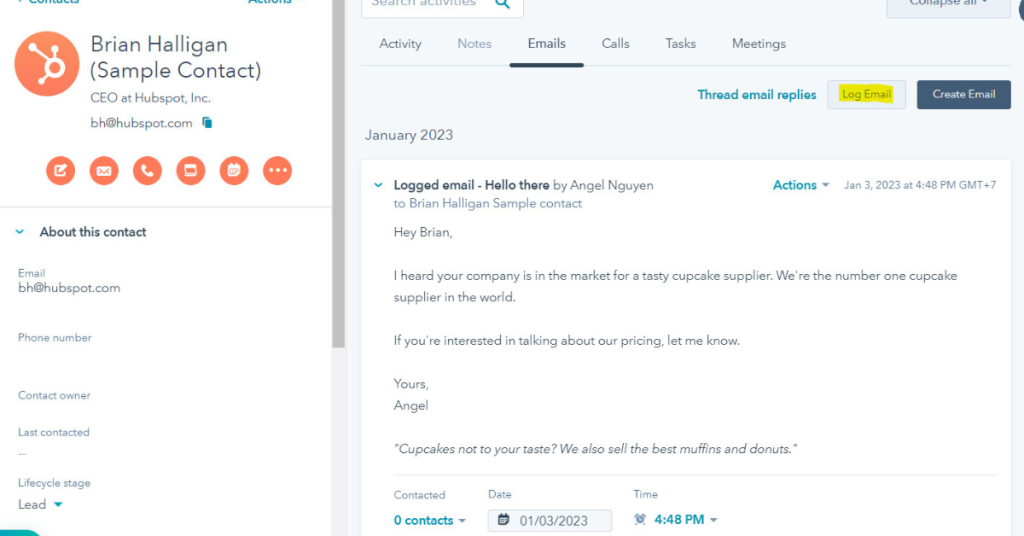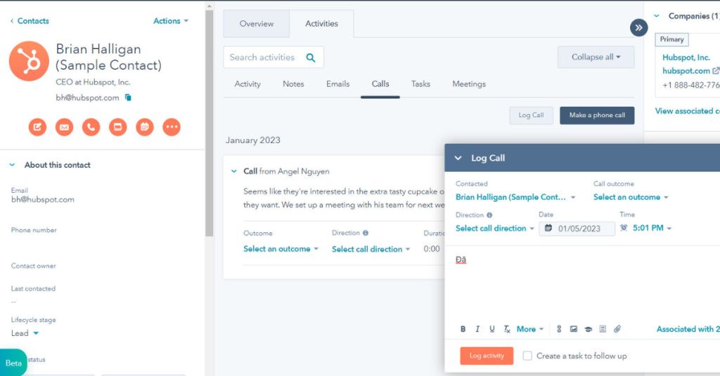 Truy cập vào Hubspot, từ mục Menu chọn Contact để xem contact bất ki trong danh sách. Sau đó vào phần Activities để thực hiện các hành động như Notes, Email, Calls,…