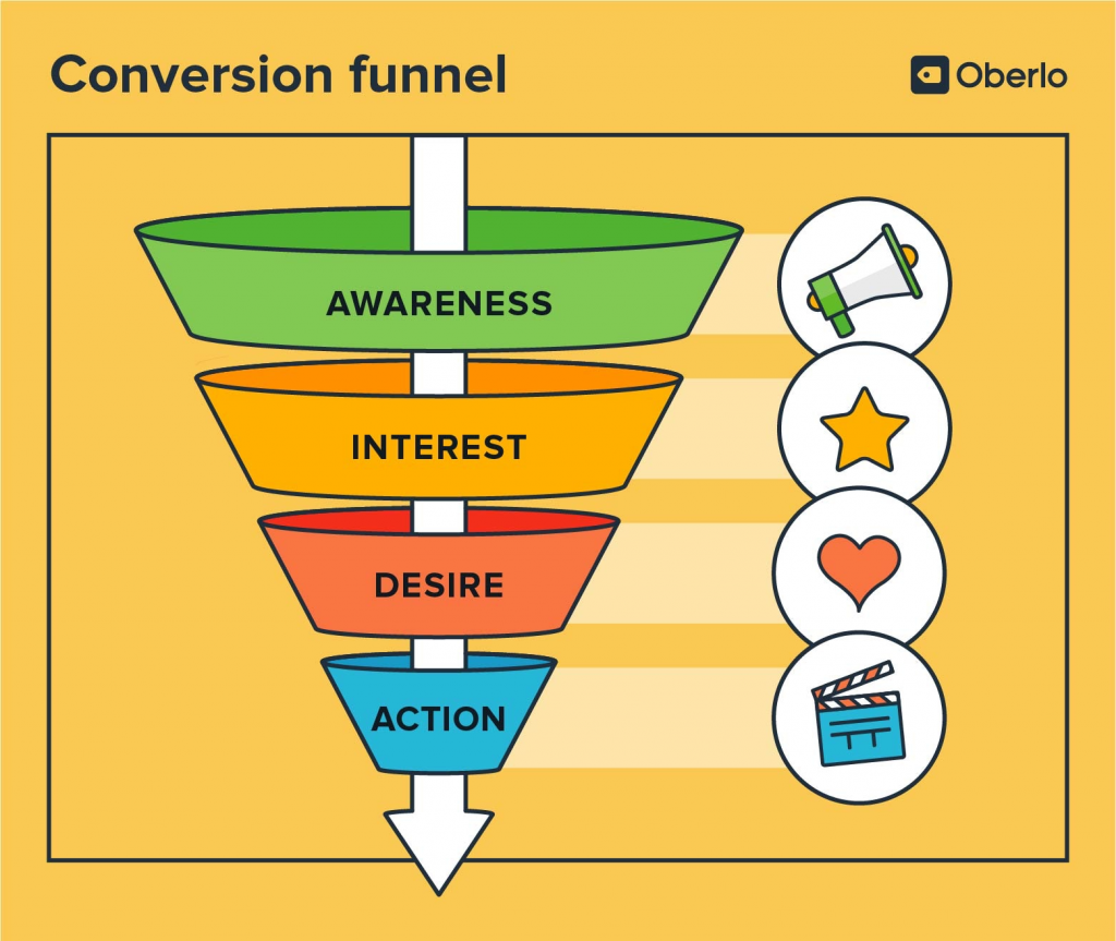 - Conversion Funnel (phễu chuyển đổi): Khách hàng sẽ trải qua các giai đoạn từ nhận biết đến quan tâm, khao khát mong muốn đến hành động
