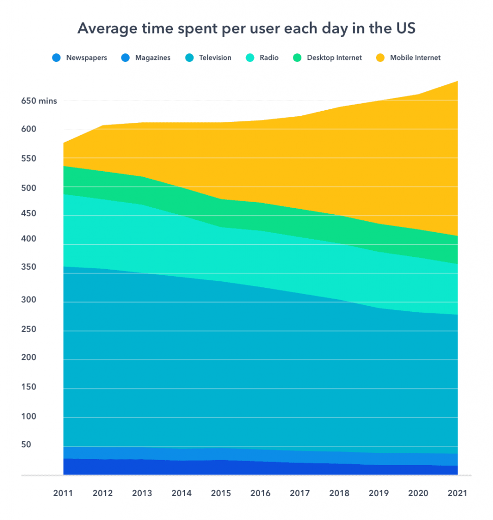 Dự kiến vào năm 2020, một người trung bình sẽ dành hơn mười giờ mỗi ngày trên điện thoại hoặc máy tính của họ và sử dụng phương tiện truyền thông Radio, truyền hình, tạp chí và báo. (nguồn: getvero)