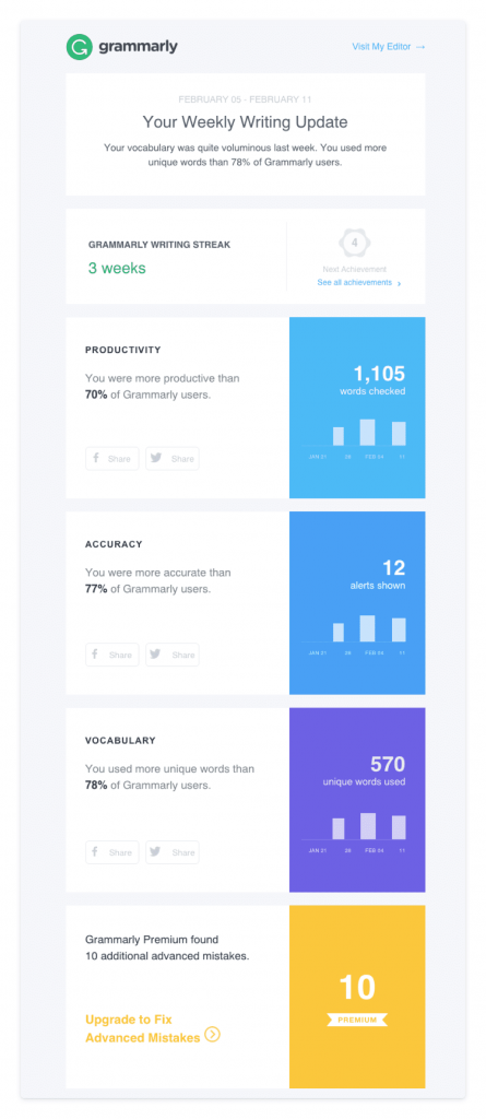 Grammarly là một công ty khác rất giỏi trong việc sử dụng dữ liệu trên các kênh tiếp thị. Email của họ được tùy chỉnh mỗi tuần, cho phép họ gửi các bài viết nhắm vào mục tiêu giúp người dùng học hỏi và phát triển.