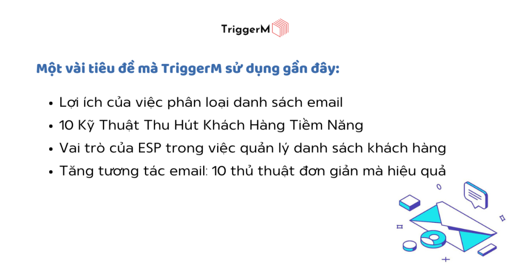 Mang tính ngắn gọn: Một tiêu đề hấp dẫn nên mang tính ngắn gọn và súc tích. Sử dụng các câu hoặc từ ngắn như “Tận hưởng ưu đãi đặc biệt”, “Cách tăng doanh số bán hàng”, “10 mẹo tối ưu hóa email marketing” sẽ tạo sự rõ ràng và dễ hiểu cho người nhận.