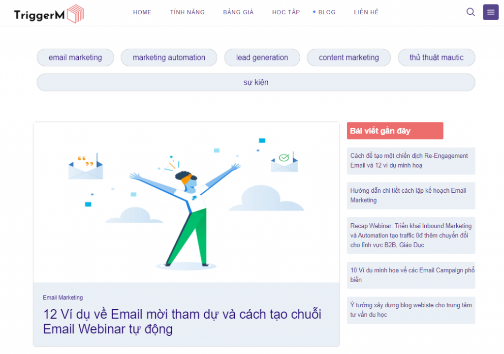 Ví dụ như: Công ty TriggerM là công ty chuyên cung cấp giải pháp về Marketing automation, công ty có xây dựng một trang blog riêng ở đó tài liệu họ chia sẻ, cung cấp cho khách hàng rất đa dạng về chủ đề như: Ebook, Case study, webinar,…và đã được tối ưu hóa các từ khóa quan trọng như: Email marketing, marketing automation, Mautic,…